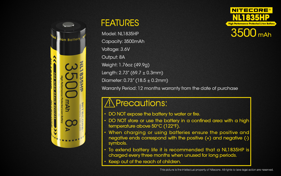 Nitecore batteries are purpose-built for high-drain, high-performance equipment. All batteries have built in internal and external safety features. It’s battery protection IC is from Seiko Instruments Japan and certified by CE, UL and ROHS.